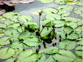池には大きな鯉が沢山およいでいます。 | レストランがあります。そして素食料理を 食べさせてくれます。 |