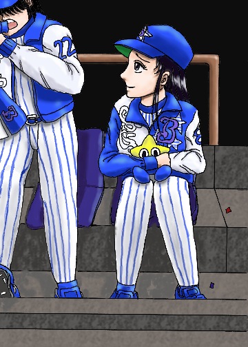 ★ 「ベイスタ観戦(お付き合い)葵ちゃん」 ★ ツヴァイ様による、3333ヒットのキリリク、なんですが。 前作にも増して、2ヶ月近くも待たせてしまいました……(汗)。 風邪で死にかけたあと、花粉症の初体験にまで襲われまして……(汗)(汗)。 本来は、姫単体でのリクだったのですが、 設定上、姫のひいき球団の情報はありません。 ていうか、たぶんプロ野球のコトなんて、ぜんぜん知らないでせう。 一方、主人公の設定は、各プレイヤー任せ。 たうぜん、ウチの主人公はベイスタファンということに。 というわけで、カレにムリヤリ誘われて、という設定で、こんなかたちに。 誘っておいて、自分には見向きもせずに応援に夢中。 そんな主人公に、少々困りながらも、 そんなコトにムキになるカレが可愛くも思える。 そんな複雑な視線です。 姫の頭が、少し大きくなってしまいました。哀。 球場のイスの資料がなかったため、座布団みたいになってしまいました。 球場の、どこにこんな配置の席があるんかい!? というカンジに……。 以下、キリがないので略。 |