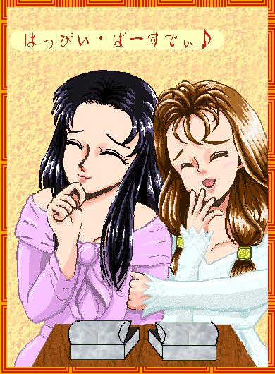 「はっぴい・ばーすでぃ♪」 2001年、葵姫のお誕生祝い画、「part 2」 です。 なぜ紗夜ちゃんがゲストなのかというと、 9月生まれ仲間(7日)ということで、 共同お誕生会を開いたという設定なのです。 で、なぜウケているかというと、 お互いへのプレゼント(目の前のハコ)が、 なんと、まったく同じ品だった! というコトに、なのです。 まあ、二人がくっついて、仲良く笑っている―― と、いう絵を描きたかったんです。結局。 時間が無かったので、タブで直描きです。 しかし、下書きした方が早かったかも――(汗)。 ドレスは哀しい出来だし、 設定のキモであるふたつのハコ、 オルゴールには見えませんね――。 オルゴールなんですよ……実は。 とにかく、ふたりの「髪の毛」に、 死ぬほど時間を取られました。 姫のアタマがでっかくなっちゃったし……。 さらに、「jpg」圧縮で、画質が。 「png」なら、3/1の容量で済み、 しかも、もっとキレイなのに。 png普及委員会――! |