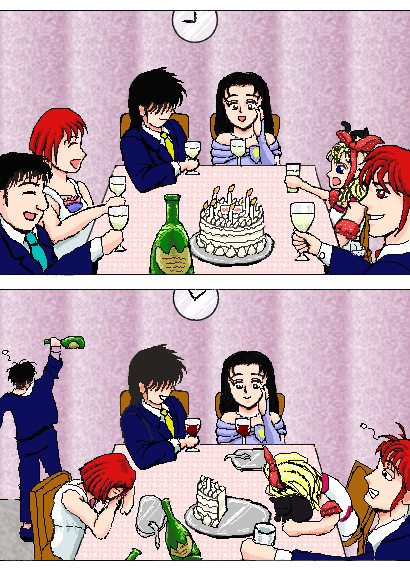 「酔い潰せない」 2001年、葵姫のお誕生祝い画、 「part 3」 です。 「おめでとー!」 みんなの祝辞の合唱とともに、 和やかに始まったお誕生会。 数時間後――。 「くーくー」 小蒔は、酔いつぶれて寝ている。 「すーすー」 京一あたりに飲まされたのか、 ノンアルコールのシャンパンだったハズの マリィまで、メフィストを枕に寝ている。 「うがーっ」 見た目によらず、 酒に弱い醍醐が暴れている(笑)。 「ぜってーおかしいよ、おまえら……」 半ば眠りこけながら、つぶやく京一。 その視線の先には―― 「このお酒も美味しいわ」 「レモンハートっていうラム酒だって」 平然と、まったくペースを崩さず、 アルコール度75.5、世界最強のラムを楽しむ、 龍脈カップルの姿が――(笑)。 |