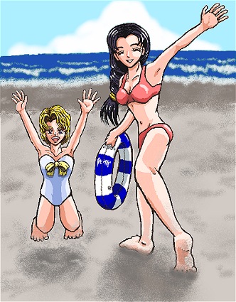 2002年の葵館・暑中見舞い……なんですが。 完成したのは残暑もいいとこ、 クラゲも出る海水浴にはいささか時期はずれな頃。 砂浜も少し暗い色あいで寂しいし、 ちょっとナンですねえ。 しかし、時間がかかり過ぎていたので、強行掲載。 姫のビキニと、マリィの初水着でご勘弁。