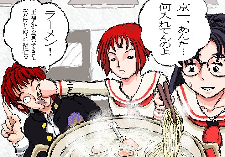 「闇鍋?」 佳様による20000ヒットキリリク、「魔人衆による鍋画」です。 どんなに謝っても追いつかないほど遅くなって、申し訳ございません(汗)。 いつもの五人衆によるだんらん画は、 某所で同じネタを見てしまったので、描く気を失い……。 いろいろ考えあぐねた結果、こんなヒトコマ漫画もどきになってしまいました。 たぶんここは理科室(ガスがあるから)ではないかと。 で、昼飯に鍋を目論むも、闇鍋と化してしまい――てな感じで。 アキレるあまり、目がうつろなアン子と、 鍋料理でまでラーメン食うかコラぱーんち! な、小蒔。 ハシ描くのがむつかしかったです(笑)。 あと、鍋は土鍋のつもりだったのに、巨大な鉄鍋みたいに……。 |