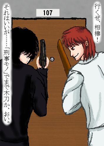 残念ながら、私が「あぶ刑事」を知らないもので、 単なる「刑事モノ」にすぎなくなり、 しかも京一がまた「木刀ネタ」をかましたもので、 それすら成り立たず、 コントまがいになってしまいました(笑)。 すすすすいませぇぇぇん。ごろんごろんごろん。
