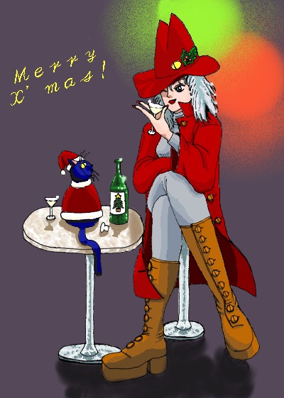 「・・・フツーは、サンタクロースとかを連想すると思うんだケド。」 「それじゃ、当たり前すぎてつまんないじゃない。」 「・・・ふぅ。ソレより、まずは自己紹介だと思うよ」 「ni^hao^! 我姓名美影、猫人的種族。請給我好吃的酒! 我愛好吃的酒。是? 我喜喜! 謝謝!」 「こらこらこら、イキナリ中国語でまくしたてない! それも似非。 さらに、ドサクサ紛れに"美味しいお酒ちょうだい!"とか言ってるし」 「<猫人の美影>なんて中華風味の名前つけたヤツが悪いのよ。 それに、似非なのは、しょーがないでしょ。イチバン大切な文字、 <ni^>(あなた)が表示できないんだし・・・。それより、あんたも挨拶 したら?」 「え? おいらは、ずっと案内猫でやってるカラ・・・」 「それは、<本体>とごっちゃにしか、認識して貰えてないわよ。 ビジュアルで出ちゃった以上、新キャラ扱い!」 「うー。・・・当サイトの案内役、でぶ猫の、遼でふー。 ねごと以外に地のキャラで出るのは、始めてかなぁ。 ちなみに、上の絵では、左のサンタ帽かぶった猫のほうだよ。」 「そして、右の美女が、あたし。ちなみに、あたしの名前の <美影>は、<メイユィン>(me^i / yi`ng)と読むのよ。 <猫人>は<マオレン>(ma-o / re'n)。 しっかし、口元が、イマイチ気に入らないわね、この絵は・・・。 もっとしっかり描きなさいよ!」 ぱぁん! 「いでぶ! なんで、おいらを叩くかな! しかも、金属製のハリセンって、凶悪すぎるよ・・・!」 「しょーがないでしょ。ここでは、あんたが<本体>の代理なんだから。 あたしら、世に出るには、<本体>に描かれるしか手が無いっての、 カナシイわよねえ。ヘタクソだし。言っとくけど、あたしもっと美人よ」 「ねえ、初登場で、しかもトップで、グチばかり言うって、どうかな・・・」 ぱぁん! 「わかってるわよ。クリスマスまでは、基本的にこの絵が載ってるから、 みなさんよろしくね。では、再見(また逢いましょう)!」 「いでぶー・・・(テーブル下で頭を抱えてうずくまってる)」 |