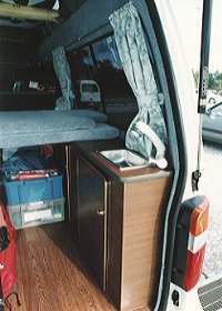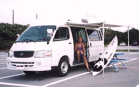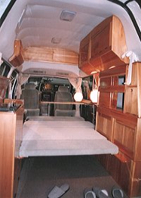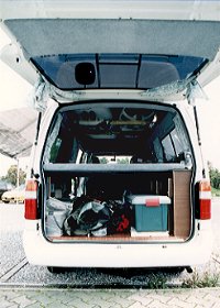 2000年2月18-20日 東京有明ビッグサイトのキャンピングカー・フェスティバルへ 足を運んだのがきっかけで、ハイエースやグランド・ハイエースの中身をいじるだけで 左図のようなキャンピングカーができるのかと関心させられました。