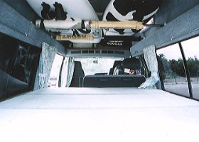 | そして待望のひろ〜〜〜いベッド。 欲しかったんだよな、コレ。 変な意味ではなく(笑) 黒フィルムが貼ってあるので外からはまず見えませんが、それでも気になる場合は カーテンを閉めれば落ち着いて休眠することができます。 これで長距離運転でも苦にならない。 疲れたらゴロン。(^^; ちなみにボードは後部座席用エアコンの上を突き抜けて収容しています。 屋根を足しているので出来る技かな、but 高くついた〜(苦笑)。 |