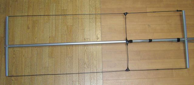 ループエレメントには、3.5mm^2 の銅単線を用い、大きさは横 1150mm X 縦 380mm 程度です。長手方向のブーム(支持棒)には、強度が必要なのでアルミパイプを、左右端の垂直部材には小径の塩ビパイプを利用しています。