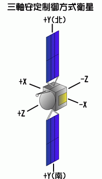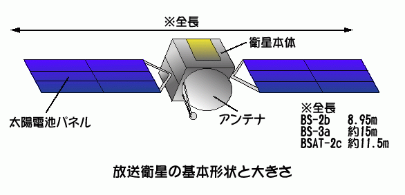 静止衛星とその軌道 作家、アーサー・C・クラークが、論文の中で静止衛星のアイデアを提唱してから数十年。彼はその中で、静止軌道上に最低三つの衛星を、120゜の間隔で配置することにより、全地球規模の通信網を構築できる、という素晴らしい構想を示しています。 現在では、身近な放送衛星はもとより、各種気象観測衛星、ドコモの衛星自動車・携帯電話サービス、インテルサット等々、静止衛星は我々の生活において必要不可欠な存在となってきています。 静止衛星の放送分野での実用化は '65 年、米シンコム 3 号による東京オリンピック中継の、成功によって幕が開かれました。従来、周回衛星による中継では、中継可能時間が限られてしまい、とても不便な物でした。 我が国での放送衛星の実験は、'78 年に打ち上げられた BSE(ゆり:決して狂牛病ではありません。BS-Experiment です(^_^;)によって開始され、各種の実証試験・データ収集を経て後の BS-2a 号機での試験放送へと続きます。 そして静止軌道は、高度約 36000Km の赤道上空に唯一一本だけです(赤道面と、軌道面が一致)。スペースシャトルや ISS(国際宇宙ステーション)の高度が数百 Km、地球の直径が約 12000Km 程度なのを考えると、なかなか遠い?ことが解ると思います。 これらのことから静止軌道は国際的な資源となっており、チャンネル割り当て同様 WARC により、各国の静止位置が取り決められています。 我が国の放送衛星用静止軌道は、東経 110゜上空でこの静止位置には日本の他、韓国・北朝鮮、パプアニューギニア等も利用できることになっており、韓国では日本に先行しデジタル BS(SD)を開始しています。 放送衛星の概要 下図が、放送に使用される典型的な三軸安定方式(後述:衛星の制御方式)衛星の基本形状、及び大きさです。衛星本体を中心に大きな太陽電池パネルが、ちょうど鳥が翼を広げたような感じについています。 また、衛星本体の一辺はおおよそ、人間の背丈ほどあり衛星の種類・世代によって、若干の違いがあります。旧型の BS-3a では約 1.3x1.6m 程度、最新の BSAT-2c でおおよそ、1.2m 角前後あります。 この型式の衛星では、衛星本体姿勢はそのままに、太陽電池が常に太陽の方へ向くよう、そのパネルには回転機構が備わっています。 太陽電池パネルは、中継器や衛星本体などを駆動する電力を発生する、とても重要な物です。 BS-3a では打ち上げ当初から、衛星の不良により所要の発生電力が得られないため、この衛星だけでは 2ch 同時放送しかできず、残り 1ch を老兵 BS-2b が肩代わりするという状態が続きました(原因は設計・製造ミスとも言われているが定かではない)。 また '94 年に、BS-3 で太陽電池パネルの回転が異常になってしまい、正しく太陽の方向を向かず放送が中断する、という事故がありました。 さらに'01 年には、BSAT-2a に太陽風の影響によって姿勢変動が生じました。これは特に、過酷な宇宙環境の様子を物語っています(さすがは太陽活動の※極大期です)。 ※太陽は約 11 年周期で最も活動の活発な極大期を繰り返していて、 有害な太陽風による影響が顕著です。最悪、衛星の故障を引き起こす こともありその他、突発的に起こる太陽フレアによる影響もあります。 このようなことはあってはならないのですが、いかんせん衛星は修理の効かない静止軌道上にあります。残念ながら過去から現在にかけて機器の不具合や、故障は間々発生しています(打ち上げ及び、軌道投入失敗とは別問題)。 そのような諸問題もあり、衛星系のシステムでは現用衛星と、予備衛星という最低でも二機体制での運用が一般的です。 次章で衛星の主要諸元を示しますが、衛星が地球の影に入ってしまう、”食“の時期には太陽電池に光が当たらず、放送に必要な電力を賄えないため以前は、放送中断を余儀なくされていました(昔は、BS のテレビ欄には食のお知らせもあった。又月による食は短時間なので影響は少ない)。 しかし、年々衛星も改良され少なくとも BS-4 先行機以降、大容量バッテリ搭載で食による放送中断は解消されています。また衛星の管制業務などが、(株)放送衛星システムに移管されてから、BS-4 先行機が BSAT-1a という呼称に変更され、それ以降打ち上げられる衛星は、BSAT-nx と呼ばれています。 衛星の主要諸元 次に放送衛星の主要な諸元を、BS-3a・BSAT-2c と新旧合わせてご紹介します。旧型は既に寿命を過ぎていますが、比較のため掲載したいと思います。