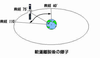 運用の実際と静止軌道上の位置精度 さて前章でめでたく、”静止化“された衛星ですが軌道上では、様々な要因により軌道を乱されてしまいます。一度、静止軌道に投入したからと言って、衛星の自律機能のみで運用できるわけではありません。 静止衛星の軌道維持精度は、緯度・経度方向に対し±0.1゜となっています。実際にどれほどのものか解りづらいと思いますが、地球からみて静止軌道上の±0.1゜というと概算で約 150Km 四方くらいになります。 現在では、BS デジタル機・アナログ機に加え、CS110゜と呼ばれる衛星も加わり、現用機だけでも三機体制となっています。この三機体制の実現には、先のエリアをさらに経度方向に三分割し、それぞれ約 0.06゜の以内に各々の軌道を維持することで実現しています。 衝突の危険があるのではないか、と思われる方もいらっしゃると思いますが、おおまかにいえば関東平野くらいの面積に、衛星が数機という密度なので、簡単にぶつかることはありません。 これらの高精度な軌道維持に不可欠なのが、小型スラスタ(ガスジェット)による軌道修正です。既述の通り衛星には、様々な力が作用しています。 衛星は静止軌道上で、秒速約 3Km という速度で移動しています。この軌道を乱す要素としては大まかに、太陽、月など天体による重力、太陽光による輻射圧、地球の形状が完全な球体でなく、赤道上の重力分布が不均一なために生じる力等があります。 このうち、天体からの重力は軌道をずらす様に作用します。太陽光の輻射圧は衛星を加速しますし、最後の力は衛星を加減速するように働き、軌道を維持するうえでやっかいなものばかりです。 これらの力のため、放っておくと衛星は徐々に軌道からずれてしまいます。 衛星を放っておくと・・・ 先ほど挙げた衛星が受ける力の順に、具体的にどのような影響を受けるかを簡単にまとめてみました。 まず、天体からの重力による影響では、軌道面(軌道傾斜角)が徐々にずれていき地球からみると、ちょうど上下に揺れるような動きになります。これもわずかではありますが、放っておくと徐々に増加していきその量は、年間 0.8゜程度です(天体の運行によるので影響の度合いは年により変化)。 次に太陽光による輻射圧の影響で、地球から見てちょうど一日周期で左右に揺れるるような力を受けます。従って衛星は、先の重力による影響とあわせると、約 24 時間周期で南北に縦長の楕円を描くようなふるまいをします。 残りの重力分布不均一による影響では、衛星を周期的に加減速するような力が働きます。 具体的には地球から見て、静止位置である東経 110゜上空から、西の方へ漂っていくように見えます。その量は、おおよそ 15 日で 0.1゜とわずかですがこれも、放っておくとどんどんずれていってしまいます。 軌道修正 さて放ってはおけない衛星の軌道ですが、これには地球から見て東西方向の修正と、南北方向の修正があります。 一番頻度の高い東西方向で通常、2〜3 週間に一度小型スラスタをふかして、軌道修正を行います。この場合、地球から見て西の方にずれていくわけですから、逆に東の方に押し戻してやるわけです。 次に南北方向ですがこちらは通常、2 ヶ月前後に一度修正を行います。軌道傾斜角の修正になるわけですが、東西方向の修正より多くの燃料を使います。 また、比較的長時間スラスタの噴射を行いますので、姿勢変動を生じる恐れがあり、細心の注意が必要です。 このように、軌道修正は衛星管制において、姿勢制御と並ぶ重要事項です。このほかにも、衛星の健康状態の監視を行ったり、支障発生時に該当機器の分離・予備系への切替制御をする等々、様々な管制業務のおかげで静止衛星が無事、運用されているわけです。 |