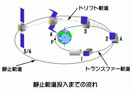 打ち上げから軌道投入まで 本章では、静止衛星の打ち上げそして、軌道投入までの流れを簡単に解説したいと思います。打ち上げに関しては、海外及び国内を含めニュース報道などで、目にしている方も多いかと思います。 実は打ち上げ後から、軌道投入までの間には数多くのステップがあり、どれも欠くことのできない重要なものばかりです。打ち上げに関しては、実は物理的理由によって国内より、海外の赤道近くの射場(打上げ場)の方が有利です。 既述の通り静止衛星の軌道面は、赤道の描く平面(赤道面)と一致しています。この赤道面に対する角度を、軌道傾斜角といいますが静止衛星の場合は、これが 0゜でなければいけません。 高緯度ほど打ち上げ後の軌道には、赤道面に対する傾斜がでてしまいます。そして、もし射場が赤道上ならば、初期軌道も赤道面と一致することになります。 すなわち、赤道付近で打ち上げた方がこの、軌道傾斜角の修正(後述)が少なくて済み、燃料を節約できるのです。そのため、数ヶ月分ではありますが後の軌道修正用燃料を、多く積んだのと同じ効果があると言えます。 欧州アリアンスペース社の射場が、赤道付近の南米ギアナにあるのはこのためです。国内では、お馴染みの種子島にあります(^_^;)。 打ち上げ手順 それでは、HII-A 二段式ロケットを例に静止衛星の、打ち上げ手順を簡単にご紹介したいと思います。 更に、ある程度高度が上がったところで(図中 2 番)、個体ロケットブースター(補助ロケット:SRB-A)を分離、さらに高度が上がると大気が希薄になり、衛星を保護しているフェアリングが不要になるので、これも分離(図中 3 番)されます。 次に第一段目のロケットが燃焼を停止、分離(図中 4 番)されますがここまでで、打ち上げからおおよそ 7 分弱かかり、このときの速度は秒速約 5Km です。その次には第二段目のロケットに点火、ロケットはさらに上昇をつづけます。 この時点ではまだ、地球をまわる低高度軌道に乗れるスピードしかありません。更にタイミングを見計らい第二段エンジンをもう一度点火(図中 6 番)、更に加速を続けトランスファー軌道と呼ばれる、楕円軌道にはいります。 余談ですが '03 年に起きた、HII-A 6 号機の固体補助ロケット(SRB-A)分離失敗は、ちょうど図中 2 番の手順でおきました。おそらくテレビニュースなどで、映像をご覧になった方もいると思います(失敗としては最悪の破壊指令という結果(^_^;)。 多段式ロケットは、次々と燃焼が完了して不要になった部分を、切り離していき身軽になっていく必要があります。このような分離失敗があると、ロケットは余分なお荷物を背負ったまま飛行を続けることになり、衛星を予定軌道に投入できなくなってしまいます。 まず用済みになった、第二段ロケットを分離(図中1)します。このとき、図中 P 点の近地点高度が約、200Km、A 点の遠地点高度が約、 36000Km のトランスファー軌道と呼ばれる楕円軌道に入ります。 ※トランスファ軌道では、衛星を回転させて一時的にスピン安定制御を 行います。 その後衛星本体にある、アポジモーターと呼ばれる小型ロケットを、図中 A 点でタイミングよく点火し、このトランスファ軌道から点線で描かれた、ドリフト軌道(※)へと移ります。 ※ドリフト軌道:この場合はわずかに静止軌道とはズレたという意味で、 走り屋が地上で行うドリフト走行とは直接無関係です。 ここでうまく点火が行われなかったり、何らかのトラブルがあっても静止軌道への投入は絶望的になりますから、なかなか重要な作業です。またこのとき、軌道傾斜面の修正も同時に行われます。 かつて静止軌道投入に失敗した、我が国の技術試験衛星のなかには、このときアポジモーターが正常に作動しなかったため(燃料噴射が停止不能に陥った)、ずっと楕円軌道のまま暫定運用せざるをえなかったものがあります。 さらにドリフト軌道上では、姿勢を適切に変えたり太陽電池パネルを展開(図中 4 番)したりしながら、図中 5 番で三軸姿勢を確立し、東経 110゜・赤道上空の所定位置にて静止化されます(図中 6 番)。 またここまでで打ち上げから、おおよそ1ヶ月という日時がかかっています。 |