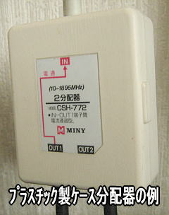 ・分配器などは金属シールドされたものを! 分配器などの配線機器類は筐体がプラスチックケースで、同軸ケーブルをネジ止めするだけのような簡易型はロスが比較的多く、外来ノイズの影響も受けやすいため推奨しません(右下写真)。 また盲点としてはテレビのほか複数台のレコなどを接続していて、全てが数珠繋ぎとなっている場合は末端に行くほどレベル低下が激しくなります。 このような場合は壁のコンセントから直に分配器を用いて分岐し、そこからテレビなりレコなりに配線したほうが全体のロスを減らすことができます。 ・それでもなお改善に至らない場合 とくに送信所から距離がある場合などは最大で 3.6m+1.8m(強度が落ちるので 1.8m×3 は推奨しない)として、全長 5.4m のマストを用いる事も受信レベルをあげるためにより有効です(3.6/5.4m マストでは必ずステーは上下 2 組しっかりと張ること)。 それ以外ではアンテナ素子数を増やしたり(14→20 素子→30 素子。更に素子が上下 2 列になったスタック型にするなど)、雑音指数(NF とも言う)のできるだけ低いブースター(高価でも電源部の分離した直下型を推奨)を用いるしかありません。 ただし基本はあくまでアンテナで受ける電力を最大にしつつ、なおかつ配線機器類でのロスを最小限にしてテレビ機器まで接続することです。それでもどうしても受信レベルが改善されない場合には、できるだけ低 NF のブースターが有効かもしれません。 一見、ブースターなら地デジ用でも CATV 用でも、何でも OK に感じるかもしれませんが、特に CATV 用はケーブルや分配ロスなどの電界強度レベル補償用であり、C/N 比の改善効果がないばかりかかえって悪化する場合すらあるので要注意です!。(CATV 用はリサイクルショップなどに大量に出回っているが、安価でも決して手を出さないこと!) これは雑音指数が高いと増幅後の信号に含まれるノイズも多くなり、信号と雑音の比率が改善されないためです。理論的に使用するテレビ機器類のチューナー部より十分に低い NF でないと C/N 比改善は見込めないのです。(設備設計上受信機の NF は 7dB を想定しています) 具体的には NF が 3dB・利得 30dB のアンテナ直下型ブースタを用いた場合、トータルの NF が 2〜3dB 改善され結果的に、4〜6dB 程度 C/N 比を改善できる見込みがありますので参考にされてください。若干重複する部分がありますがより詳細にブースターの効能を理解するには、前項の安定受信の条件を熟読されてください。 これまで”直下型“と明記したのは、そうしなければ改善効果が極めて希薄になるか、最悪効果がない場合もあるためです。ブースターをアンテナ直近に設置することは鉄則と思ってください。 またアンテナ入力レベルがあまりにも低い場合、改善効果が期待できないこともあります(ブースターの最低動作入力レベルに満たない場合など)。しつこいようですがあくまで基本的にアンテナでの受信レベル向上とシステム全体のロス低減につとめるよう心がけてください。 |