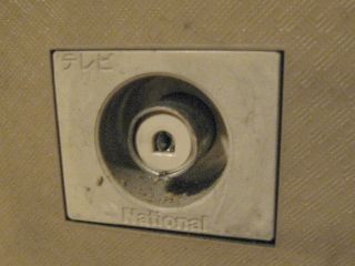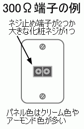 上記右側写真の壁面端子はほぼ最新と言って良いタイプで、F 型コネクタ※になっており屋内配線・分配器等の設備の問題は少ないでしょう。 ※インピーダンス整合型。写真の化粧パネルは昭和末期のもの。 バブル崩壊前後からユニット表面と同色系の外枠が露出しないものが主流。 地デジ視聴に支障をきたす恐れは少ないといって良いと思います(近年施工、もしくは設備更新されたものと言える)。 端子にネジが切ってあるのですぐ判別できますし、横から見ると若干壁面から出っ張っているのもポイントです。ただしあくまで設備の年代判別の目安にすぎませんので、参考程度にとどめて頂ければ幸いです。 ・要注意または要交換 注意が必要なのは上記左側写真にあるようなタイプの端子。 これは二十年以上前に施工された事例ですが、この年代になると VHF のみ(とくに南関東)の視聴しか考慮していない設備が多く屋内配線も 5C-2V などロスが若干多く、シールドの甘いタイプの場合がほとんどなので要注意です。 地デジアンテナをきちんと設置・調整したのに一部の部屋でレベル不足が発生する、などといったつまらない障害を起こしがちなのがポイント。従って新しい設備と比較してアンテナでの品質確保が、より大変になる恐れがあるでしょう。 分配数が多い、アンテナ電界が低いなどの理由でどうしても品質確保が困難な場合は、屋内配線・分配器・壁面端子を含めた設備更新が必要となる可能性も高くなってしまいます。 またこれは切り分けしづらいパターンですが、マルチパスのない CATV やフレッツ TV、又はマルチパスのほとんど発生しない BS/CS において、ある特定 ch 付近(設備全体、特定の部屋で発生するか否かはケースバイケース)のみ電界が落ち込む場合はバイパスや一部機器交換などの処置が必要となります。 これは共聴設備の一部において RF 的な同調点がうまれ、電界の落ち込む周波数帯が発生している可能性があるためで、やっかいな事例のひとつでしょう。 ・共聴設備まるごと交換が必要な例 下図に古い壁面端子の具体例を示します。 | ||