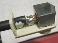 同軸ケーブル・リボンフィーダー兼用でかつては便利だったのですが、この時代のものになるとシールドされていないため、ロスが比較的多くノイズにも弱いため使わない方が無難です。 最悪の事例としては写真のものと似た 75/300Ω兼用タイプで、特定 ch のみ極端に受信レベルが下がるというものがありました。 他 ch は全てマージンが多くあるのですが問題の ch のみ、良くてテレビ・メーカ推奨値ギリギリ、低下した際にはマージンを割り込んでブロックノイズだらけ、というていたらく。 原因はこのタイプのプラグ内にはインピーダンス変換.用のメガネコア(バラン)がはいっており、無シールド(厳密にはインピーダンスの乱れ)と相まって結果的に BEF の如く作用していたため(21〜28 の物理 ch のうち 22ch のみが落ち込んだ。RF 回路的に同調点が発生しエネルギーが吸収されることによる。ディップメータの原理同様)。 上記事例ではきちんとしたねじ込み式の F 型コネクタ(文末で紹介)に交換しただけで、ウソのようにトラブルが解消しました。問題のプラグには J○C の刻印があったのが印象的です(超ボカスカ。便利だから、といって無シールドワンタッチプラグをむやみに使わないように ノノ*^ー^;) )。 |