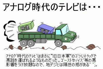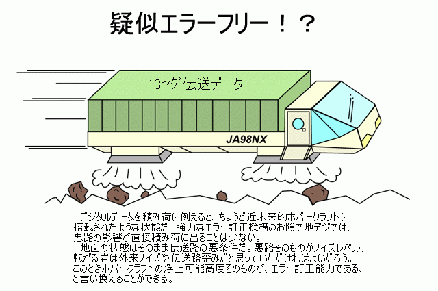 | ※理論的にはブースタを入れると NF 値だけノイズが加算されるうえ、 信号は共聴システムを伝送されていく途中、徐々に減衰していく。 従って同じブースタを使用する場合でも図を見て解る通り、アンテナ 直下へ設置したほうが結果的にブースタ出力の C/N 比改善効果が 最大となる。 他項と重複しますがとくに注意しなければならないのは、ブースタの NF(雑音指数)でこの値が高いと増幅後のノイズ割合が増えることになってしまいます(NF=入力 C/N と 出力 C/N の比であるため)。 NF が高いと上図の通り「ノイズレベル」ごと、信号が持ち上がってしまうことになりノイズと信号の比率が、改善しづらくなってしまいます(赤塗りで底上げされた部分も増えるるため)。 よくオークションやリサイクルショップなどで、古い UHF 用ブースタや特に CATV 用(単に業務用と表記されることもあり要注意)が大量に出回っているようですが、アンテナによる直接波受信に用いることはお勧めいたしません。 これは比較的 NF が高く根本的な用途が異なるため。地デジに限ればあまり役に立たないか場合によっては、悪化を招くだけと言っても良いでしょう(FM 放送くらいなら使えます)。 地デジ用に限れば選択するブースタの NF は悪くても、高利得タイプで概ね 3dB 以下、20dB 前後のものでも 2dB 程度を目安にして下さい。低利得タイプの場合 20dB 以下程度の製品では NF が 1.0dB という高性能なものもありますが、C/N 比改善には同じ利得ならばできるだけ低 NF タイプのほうが適している、と言えます。 蛇足ですが超低 NF・低利得ブースタは弱電界地域の、プリアンプとしても使える性能を有しているといっても過言ではないでしょう(メーカでは前置ブースタ、あるいは前置用と表記。後段の高利得低 NF ブースタと組み合わせて用いる)。 とにかく CATV 用は主にレベル補償用(電界強度)なので、決して手を出さないようにして下さい(言い換えれば品質のしっかりと確保された信号のレベル補償にしか使えない)。 デジタル伝送ならではの”盲点“ しつこいですが、ただ映るかどうかを確かめるだけでは品質をチェックしたことにならない、というのは次のような細かい理由もあります。 既述の安定受信条件(マージン・フルといって良い)をある程度割り込んでいる状態では、なんらかのきっかけにより文字通り崖をころがりおちるように、データ品質が大幅に変動してしまいます。 まさにぐらぐらとして不安定な足元を、エラー訂正のお陰でかろうじて崖から落ちずにいるようなもの、と言って良いでしょう。 デジタル無線通信の基本概念を知らない場合、安定受信条件を割り込んでいき更に数 dB C/N 比が劣化していっても、テレビ画面を見ているだけでは一見正常受信しているような気がするかもしれません(繰り返しになりますが^ ^;)。 ただしそれは”※デジタル・マジック!?“による錯覚(ボカスカ)と言っても決して過言ではないでしょう。デジタルデータをトラックの積み荷に例えると、強力なエラー訂正機構を備えた地デジは近未来的なホバークラフトで運ばれているにすぎない、と言えます(下図)。 ※”デジタル・マジック“とはアナログでははちゃめちゃに映るような条件下でも、 非常によくできた地デジのテクノロジーにより”受信画面を見る限りでは“マトモに 受信できてしまうこと。そんな魔法は存在しませんが、素人が錯覚しやすい落とし穴^ ^; |