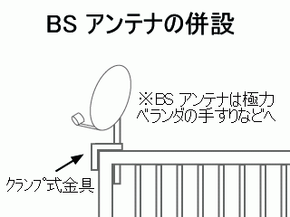 BS アンテナとの併設について 右図にあるように設置場所が許す限り、屋根上設置(単独・UHF 併設問わず)を避けベランダなどの手すりに取り付けることを推奨します。 魚の骨のごとくスカスカな UHF アンテナと異なり、BS アンテナの受ける風圧荷重は半端なものではなく、相当しっかりとした施工でない限り後々の不具合を招く可能性が高いからに他なりません。 ちょっと考えてみてください。強風下で約 40p 四方(φ45cm パラボラ反射鏡面積に近似)の板(材質は軽量な木や段ボールが適する)を手で持ち、風上に対して面を直交させてみればいかに風圧がものすごい力であるか、簡単に体験できます。 もちろん老婆心からではありますが、BS アンテナは地平線が見通せる必要もなく軒下となるだけで、かなり風の影響を低減できます。正直なところ街の電器屋さんが設置したものであっても、施工後台風が通過したら BS アンテナの方向がズレてしまった等という例もありがちですし、実例を見聞することも…なきにしもあらずなのです(ボカスカ)。 |