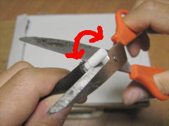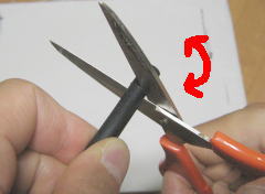 ・1 外部被覆の加工その一 まずは右写真のようにして、ハサミで同軸ケーブルを軽く挟み込んで矢印の方向に往復させながら、くるりと