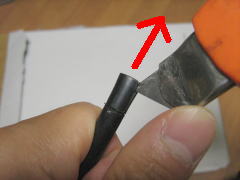 ・2 外部被覆の加工その二 今度はカッターなどで縦方向に切れ目を入れていきます(右写真)。その一で入れた外周部の切れ目に対し、直交するように刃先を持っていき編組線に軽くあたる状態まで切り込みます。そのままの力加減かごくわずかに力を抜いてから、そっと矢印の方向へ刃を動かして切れ目を入れていけば OK です(この加減は外部被覆の硬さ、作業現場の温度などに左右されます)。 刃の動かし方は、ちょうど鉛筆削りのときの要領に似ています。力を加減してくれぐれも編組線を切断しないことが肝心です。(ここはプロも同じやり方です) |