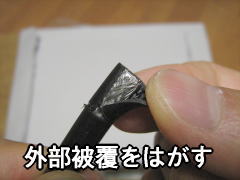 うまく切れ目が入っていれば「ペロリ」と外部被覆をはがすことができます。うまくはがれない場合は適宜切れ目を入れ直すと良いでしょう。ただしその際はあくまで、軽くなでるように刃をあてるようにしてください。 |
