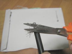 1 番目に近い要領です。右写真のようにハサミで切れ目を入れ、ごく軽く力をかけながら少しずつ切れ目を深く入れていきます。切れ目が芯線に到達するかどうか?、といった時点で絶縁体を指先でねじり取るのが失敗が少ないでしょう(写真右下)。 通常の電線被覆のように一気に絶縁体をとろう、とニッパーなどで芯線に当たるまで切れ目をいれてしまうと、芯線にキズをつけてしまったり最悪誤って切断してしまうことになりかねません(一切電線を傷つけず一気にむくには熟練が必要です!!)。 |