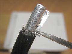 1 周キズを入れていきます。必ずしも被覆を完全に切る必要はなく、編組線に到達するかどうかといった寸止め状態がベストです。(昔は東通工オリジナル!?です) 大概はカッターなどで一周切れ目を入れる、と物の本や取説にありますがこれが慣れないと、難しいところではないかと思います。 この方法では不意に編組線を切断してしまったり、ということも多いのではないでしょうか。 もちろん落ち着いて机など水平な場所にケーブルを置き、カッターの刃を上から当てながらケーブル側を転がすようにすれば、比較的うまく行きやすいかもしれません。逆にオリジナルの方法ですと屋根の上など、作業現場を選ばないのがポイントです。 |