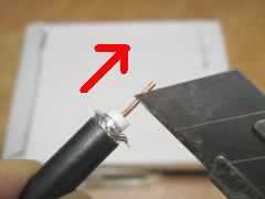 作業ははカッターの刃先を斜めに軽くあてて削るようにして行います(右写真)。このとき必ず手前に刃先を向け同軸先端側にカッターを動かすように作業してください。大切な芯線を傷つけないためですから、刃をあてたまま逆方向へ刃を動かしてはいけません。 |