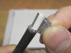 F 型コネクタの中心コンタクトの役目を果たす部分となりますから、面倒でもやり直しが必要です。なぜならば数回抜き差しするうちに芯線が折れてしまう恐れがある上、コネクタ類(メス側)の内部に折れた芯線が入り込むと非常にやっかいだからです。やはり机など平らな場所が確保できれば、カッターを内部絶縁体に直交して軽くあてながら、同軸ケーブル自体を回転させる方法で除去しても構いません。 |