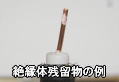 ・内部絶縁体残留物の除去 その他特に注意すべき点として右写真のように、内部絶縁体残留物(白いカスのようなもの)が芯線に付着している場合は必ず除去します。面倒でも決しておこたらないでください。接触不良の原因となり受信障害に直結します。 |