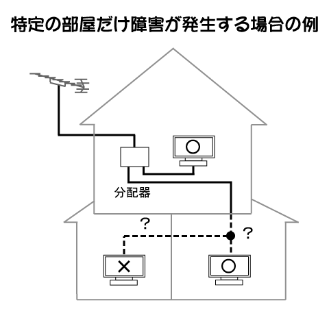 これは分配や配線(もちろん設備が古すぎる)、その長さによるロスでレベル不足に陥っている典型例です。 このような場合は面倒でも分配器や配線類を交換したり、といった対策が必要でしょう。 右図の例では「?」の部分は天井裏部分に配線されていて分配・配線状況が不明な個所です。 しかしこの場合では 1 階右側の部屋では映り、左側の部屋だけに障害が現れているので 1 階側分配器から、左側の部屋までの配線に問題があることが推定できます。 ただし例にあげたように必ずしも 2F から 1F へという順に、枝分かれしながら配線されているとは限りません。 場合によっては 1F 点検口付近(大概は押入の上など)まで、アンテナから一気にケーブルを引きそこで分配している、という施工例もありますから参考にされて下さい(この場合では例とは逆に 2F の末端ほど受信レベルが下がることになるので注意!)。 このようにしてできるだけ分配器などを含めた配線状況を詳細に調査することにより、問題カ所の切り分けを行えれば最小限の投資で障害を解消できる可能性があります。 問題部分が特定できてしまえばそこだけ新しい配線でバイパスする、といった対策をとることができるからです。実際問題として屋内配線のうち屋根裏や壁内部などを通る部分は、慣れないとなかなか調査しづらいでしょう。 もちろん全体の配線機器類の交換が行えれば理想的ですが、予算の都合などで無理な場合に有効です。くれぐれも注意していただきたいのは改善を行っても、マージンがとれない場合は再び不安定な受信状況となる可能性がある点です。 ですからバイパス配線などの対策をとる際には、必ず必要長の同軸ケーブル(できるだけ 5C-FB など低ロスのもの)をあらかじめ用意して仮配線した状態で、テレビ(またはレコなど)が取説推奨の受信レベル以上になっているかを確認しなければなりません。 更に仮配線時に推奨レベル以上にならない場合は、より上流の配線類まで取り替える必要があります。ここまできてしまったら仕方ありませんので、潔く全ての分配器と配線類を交換するほうが得策と言って良いでしょう。 もし UHF アンテナを後付けした場合でアンテナから、2 階分配器までの配線が古い場合も 5C-FB など低ロスの同軸ケーブルに交換しましょう。 アナログ放送が終了しているので不要な混合器が入ったままでは、ロスにしかならないのでやはり UHF アンテナから新しいケーブルで直結しましょう(不要な VHF アンテナも撤去した方がいいのは言うまでもありませんが)。 大本でロスしていたら元も子もありません。 |