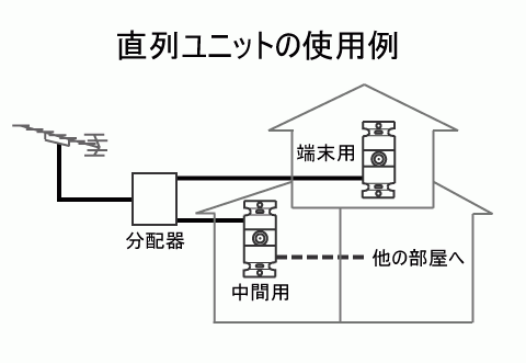 ・分配器とは異なる直列ユニットの使用法 端末用は右図 2 階部分のようにその部屋で配線が終わっている場合に、中間用は 1 階部分のように数珠繋ぎにして他の部屋へも配線を送る場合に用います。 もしも交換する際はこれらの違いに注意し、特に中間用では入力側と出力側配線を間違えると、大きなロスが生じ受信障害のもととなりますので十分気を付けてください。 また中間用直列ユニットは配線と同時に分岐もできて、とても便利な物なのですが分岐損失といってロスが非常に大きいので、必ず使うカ所は最小限にとどめましょう。 また逆に中間ユニット以降の部屋のみ障害が発生する、といった場合は真っ先にこのロスを疑うべきです。あくまで例ですが一般に 1 つの中間用直列ユニットは、4 分配器よりロスが大きいことがあるからです。 このようなときはより上流であらかじめ 3 分配しておき、それぞれ直に必要な部屋までの配線を引き直すことになります。 |