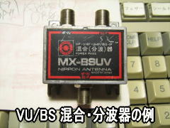 例によって BS アンテナ側は電流通過型となる、混合器を使用します。 もちろん、テレビ・レコ等 BS 対応機器でも適宜、分波器を用いて BS/UHF アンテナ端子へそれぞれ配線することで、BS 視聴が可能となります。 ポイントとしてはできるだけ BS アンテナと最短の配線となる機器にだけ、電流通過型の分波器を用いて配線し常時 BS コンバータ用電源を ON とすること(受信機器側で)。 その他の機器では全て電流通過型でない分波器を用いるか、機器側で BS コンバータ電源を切りにしておかなければなりません。 なお、混合・分波器には必ず BS 対応機器を用いてください(右写真参照)。更に同じ BS 対応機器でも古いものでは、スカパー e2 に未対応だったりする場合もあるので要注意。 パッケージ等に BS・110 度 CS 対応と明記されているものがスカパー e2 対応に該当します。 |