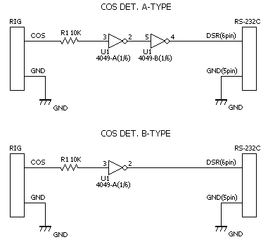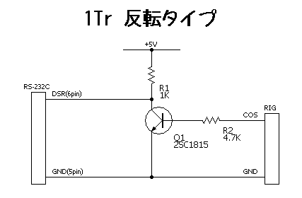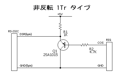 その他一般的?なスケルチ信号形式について 簡単にではありますがその他の各社リグでもっとも多いと思われる、スケルチ信号の型式について記述しておきます。 A. ポジティブなもの・スケルチ開=+<5V/閉=0V B. ネガティブなもの・スケルチ開=0V/閉=+<5V ローカル数局にも協力していただき、色々なメーカの様々な世代のリグについて、できるだけ多く調べてみました。すると、だいたいどちらかのタイプが多いようで、私のリグのようなオープンコレクタタイプは、ごく少数派のようです。 最近のリグですと、ケンウッドのものが一番素直?で、ポジそのものでした。アイコムでは、ポジタイプとネガタイプ両方が存在し、DATA 端子コネクタ(miniDIN-6Pin)まで一緒ですので、注意が必要です。 具体的には、ポジタイプ(IC-208 等)がスケルチ開で +5V、ネガタイプ(IC-7000 等)の電圧がスケルチ閉で +8V です。更に困ったことに、IC-208 ではファンアウト(取り出せる電流)が極端に少ないらしく、保護ダイオードのみ等直結に近い方法では、COS を検出させることはできません(電圧降下が激しいため PC 側が反応しない♪)。 従って、最低でもトランジスタによるバッファか、後述の A タイプ回路が必須ですので、注意が必要です。また、ここで少ないですがせっかくですので、最近のリグの COS 型式や特性について、別途表にまとめてみましたので、参考にされてください。 添付資料:各社リグ・スケルチ信号形式と特性&ノード用リグとしての評価 A/B タイプとも(IC-208/207を除く)、最も簡単なものについては直列(当然リグから、PC 方向が順方向)に、保護用のシリコンダイオードを通すだけでイケます(ポジ信号で B タイプ利用時、ECHO LINK 側で検出動作を反転させる設定必要有)。その他、簡易な方法としてはツェナーダイオードで、保護する方法などもあります。 これらは簡単すぎて、回路図を描くまでもないのでここでは、あえて掲載しません(ボカスカ)。 そこで直結に近いようなのは、嫌だという方は下記の様なものにすれば、シンプルかつ確実に動作するものができるでしょう。 特に難しい説明はありませんが、C-MOS の反転バッファを数個使うだけという、まるで芸のないものです(^_^;)。A タイプの信号方は、上側の回路を、B タイプの信号の方は、下の回路を組めば OK です。 また設定についても、反転バッファを使用しているため、どちらの信号タイプでも ECHO LINK 側の設定はデフォルトのままで OK です。 面倒でも出来るだけ PC 側出力が正論理となる方が、フールプルーフという観点からも望ましいと思います。例えば ECHO LINK ソフトウェアを入れ直したら再設定時ワケが解らなくなった♪、とかリグの電源が落ちたらネット側に送信しっぱなしになった♪、等々で焦ることもありませんヨ。 老婆心ながら、実際に再設定がワケワカになってパニクった局や、カンファレンスに無変調を垂れ流した局を何度も目の当たりにしてきたので警告しておきますヽ(´ー`)ノ。 またもしも、使用する PC 側 RS-232C の関係などで、+5V 出力動作ではどうも COS の検出が芳しくない、という場合にも対処可能です。 C-MOS の持ち味であるフルスイングを活かし、電源電圧を +8V〜+12V(Max.15V以下とすること)とすることで、出力電圧が電源電圧と同等にまで上がり、確実に検出させることが出来るはずです(特に古い PC 等)。 このように少し工夫?すれば、安い汎用部品でも安定度の高いものが製作可能です(お金が多少かかっても、完璧を目指すならオーソドックスに MAX232 等を使えば良い)。 ECHO LINK ヘルプメッセージにある、インターフェイスはジャンク BOX にあるパーツでも可能、というくだりがあります。これは COS を活用しても、なお当てはまるといえるでしょう。 こちらもシンプル化(今さら) IC の使い方を忘れてしまった方や(C-MOS の未使用入力ピンを GND に落とし忘れて誤動作させてしまう人等が該当<まじでじま!?)、なるべくシンプルに組みたい方のため?にローカル局の要望も交えて 1Tr 化してみました。 この回路でも入出力の論理レベルが反転しないので、COS がポジなタイプに最適でしょう。 たぶん Tr 動作の初歩の教科書に載っていそうな位のレベルです(ボカスカ)。 ちなみに、E と C が逆さまになるだけで、回路的にはほとんど同じのネガタイプの COS 用回路も参考に掲載しておきます。 まず非反転タイプ回路の動作について簡単に触れておきますが、COS 入力が入りトランジスタの B に電圧がかかった状態になると、E から B 間へ電流が流れなくなるため E・C 間が OFF となり DSR 側に R1 を通じて +5V がかかります(ネット側へ送信となる)。 逆に COS 入力がない平常時(RF 側受信待機時など)には、トランジスタの B が GND レベルとなり E から B へわずかな電流が流れるため E・C 間が ON となり、DSR 端子はグランドレベルに落ちるといった具合です。このような単純な回路では R1 の値がひとつのポイントで、これが高すぎると PC によっては COS を検出しなかったり、最悪の