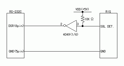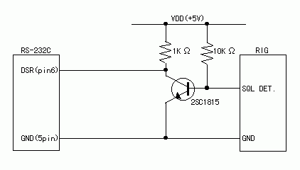即興制作したスケルチ信号用 I/F 回路(※今のところアルインコ専用) また回路図では、汎用 C-MOS 4049 となっていますが当時在庫になかったため、4011(NAND)の入力をショートして NOT の代用としています(^_^;)。(NAND はひとつあると組み合わせで色々なゲートに代用できて便利です) また電源はリグのマイク端子にでている、+5V をそのまま利用しました。C-MOS ですから、+8V など他のリグの電圧でもそのままイケます(IC 自体は 3-18V で動作しますが、RS-232C 入力への関係上 5V 以上必要です。PC の USB 端子から +5V を頂くのもアリです)。 それから ECHO LINK 側の設定ですが、TOOLS メニューから SYSOP SETTINGS で、RX ctrl タブを開きます。ここで、Serial DSR にチェックをいれ、適切な COM ポートを(TX ctrl で選択したのと同じ)選択すれば OK です。 リグを受信状態にし、他の適当なリグで短く送信してみて、確実に ECHO LINK メイン画面右下の”SIG“インジケータが点灯するか、確認します。スケルチの開閉に従って、”SIG“インジケータが点灯すれば完璧です。 以上、非常に簡単なものですがより確実な運用のために、各局のヒントになればと思います。またあわせて当方の様に、スケルチ信号が面倒なタイプの方にも、この I/F をぜひ応用していただければと思います。 更にシンプル化 各局から「最初からこれをだしてくれ」、と言われそうですが、当局のショボイ有機ニューロ&ファジイコンピュータの性能のせいです(ボカスカ)。 こちらですと、IC がいりませんから数十円(or \0)で組めるかと思います(^_^;)。これは、電圧レベルを整合するための回路を応用した、単純なものですが確実に動作します。回路的には、スケルチ信号がポジティブ(開=HIGH/閉=LOW)なタイプと比較して、抵抗の値と位置が変わった程度です。 入出力の動作レベルの関係が同じ(IC タイプと比較して)ですから、ECHO LINK 側の設定は前者の回路の場合と同じで OK です。 |