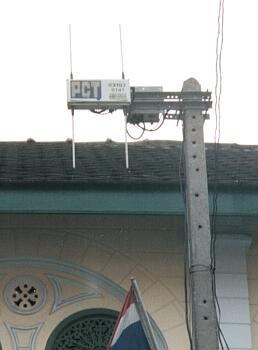 PHS サービス(PCT:Personal Communication Telephone) ※右側写真はバンコク市街でみつけた PCT サービス小型/四本槍コンビネーション局 また、意外なこと '98 年頃にはサービスが開始されていた、とのことで少々驚きました。ただ、正確なサービスイン時期は不明です。 基地局形態としては、自立柱(電柱併用多し)およびビル上設置四本槍、 GSM 併設の四本槍、または柱上設置の小型局が多かった印象があります。小型局には大きな、「PCT」という青地に白文字のステッカーが張ってあり、識別しやすかったです。 現在のところ、タイでの PCT サービス番号は 02 で始まる、バンコクと同じ市外局番がつくそうで、このあたりもおもしろいなと思います(国内とは若干システムが異なる模様)。そのほか、料金体系は良くわかりませんが、台湾の様に対応機種では国際ローミングが出来るそうです。 ローミングでも、メールやデータ通信等もそのまま使えるそうで、こういった点はなかなか便利そうです。なおバンコクでのデータ通信規格は、現在のところ PIAFS 32Kbps に対応しているそうです。また情報によれば、国際ローミングは '03 年 12 月よりとのことで、始まったばかりのようです。 基地局の間隔は、種類によらずけっこう短かったので、マイクロセルの特性をきちんと考慮した、置局法を実践しているのかな?などと、勝手に考えてしまいました。 ※左側写真は王宮側船着き場付近の基地局 アステルの CS に長いアンテナを付けた感じ それからサービス地域が狭いせいか、まだあまり売れていないらしく、現地の方の評判はパッとしませんでした。テレビ CM も以前は流れていたそうですが、最近は見かけないらしくビジネス的にも、厳しいようです。 それでも滞在中の印象では、バンコク市街部でのエリアはほぼ、網羅されているのかな?という印象でした。その後の情報によると、バンコク国際空港のあるあたりまでは、エリアに入っているそうですから、結構広い印象を受けます。 今後のエリア展開や、サービス展開については不明ですが、わたくし的には楽しみにしたいと思います。 それにしても、数少ない日本規格の輸出なので、ぜひともがんばってほしいものです(3G はこれからですし)。 |