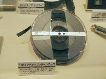これは感激です(ボカスカ)。いまから三十数年前に、実際に民生用としてはじめて開発された、”統一I型“ 1/2 インチ VTR テープの現物が展示してありました。
