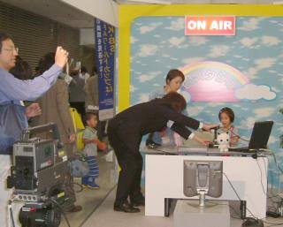 ミニスタジオに見立てたブースの、キャスター席に座り予め用意された、”原稿“を読み上げるというものです。