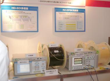 写真は左側の測定器が送信信号のスペクトラム表示、中程は模擬伝送のための光ファイバ(50km x2 巻)右側の測定器が受信信号のアイパターンで、奇麗に開いたアイパターンが表示されていました。展示は 50km 巻の光ファイバ 2 巻ごとに光アンプが入る構成のようで、100km の無中継伝送が可能であることを示しています。