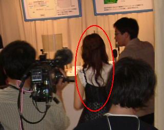 写真では解りづらい(後ろ姿だし)と思うので解説用に、アップ写真もついでに掲載しておきます。安めぐみさんはテレビで見るよりずっとステキで、意外と小柄な印象を受けました。見かけたのは「フレキシブル・スピーカ」のブースだったのですが写真の一同は、締めのコメントを収録した後他のブースへ移動したようです。