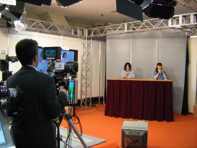 同展示ではクロマキーの代わりに赤外線照明とそれを効率的に反射する幕を使い、アナウンサーの背景にリアルタイム背景合成を行っていました。クロマキー合成では出演者の衣装のエッジ(とくに色白な女性の肌にも映り込むことがある)や目のキャッチライトに、その合成のための背景色(青や緑)が映り混んでしまうことがあり、合成結果の不自然さの原因にもなっていました。