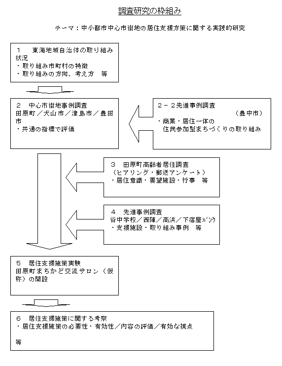 @東海地域自治体の取り組み状況(自治体アンケート) A中心市街地事例調査 B田原町高齢者居住調査 C先進事例調査 D居住支援施策実験(田原町まちかど交流サロン) E居住支援施策に関する考察 | 調査研究フロー(案) |