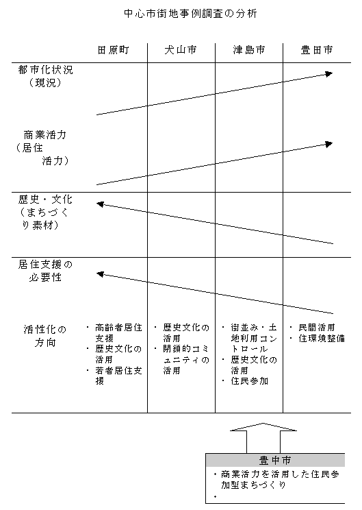 | 中心市街地事例調査マトリックスと地区別シートによる説明 | 中心市街地事例調査マトリックス |