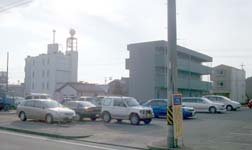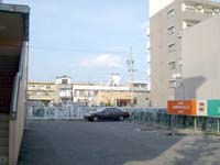 ![]() 名鉄国府宮駅(改札が地下にあり駅舎は見えない・左は駐車場とバスターミナル)/駅南の状況/駅西通りの空き地は駐車場に。奥にはホテル |