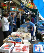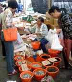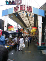 ![]() 三八市で賑わう寺町通り / 乾物屋、魚屋が多い / 商店街の端にはカートも 250mの間に50店の出店が並ぶ。 |