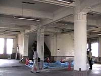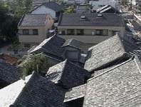 ![]() ![]() 拡幅予定の中央通りに面する旧井桁屋の外観と内部、屋上から見た町家の構造 |