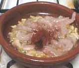| ♪スペインのバルでよく見かけるCazuela(両手鍋)料理の1つです。 残ったスープももちろんパンにつけて、Barcito(船のように浮かべて)お召しあがり下さい。 |