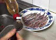 | A 酢と水を4対1の割合で合せた中に一晩つけ込む。 (いわしの身が白っぽくなるまで。) |