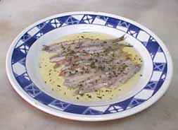 | Bいわしを皿に並べ軽く塩をして、にんにくとパセリのみじん切りを散らした後、オリーブオイルをかけてできあがり。 |