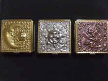 金は月、銀は太陽、銅は天使がモチーフになっています。 大きさは縦横cmの正方形で、高さは3cmです。 |
