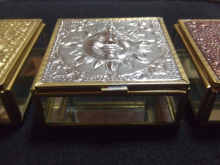 周りは透明なガラスです(・∀・) デザインはどれもかわいくて、細部にまでこだわっていて、 金の箱には、周りに星も散りばめてあったり、 銀の箱には、中心の太陽を際立たせるような凹凸が細かく細工されていて、 銅の箱の天使は矢の刺さったハートを手にしているんですよ 3つ並べてあるとメダル(金、銀、銅だから(;´▽`A``)みたいで素敵ですが、 好みの色や柄でひとつに絞るのもアリですね 鏡が上下に設置されているので、 アクセサリーはもちろん、ドライフラワーなんかを入れて飾ると、 入れたものが反射するうえに、外からは透明なガラスではっきりと見えるので良いですね(-^□^-)
