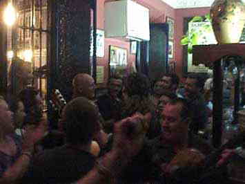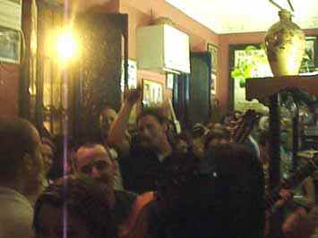 | いつもの様にBar巡りをしていた。 突然、道沿いの店からギターが響きだし、手拍子が鳴り響いた。 人が溢れんばかりの入口から中に入ると、ギターを演奏するアンちゃんに合わせ 輪ができ、その輪の中へ数人が入ってSevillana(セビジャーナ)を踊っている。もちろん、一般のお客さん。 しかも、次から次に、若い女性が、元若かった女性が、踊る。 うまい。しかも美しい。 見よう見真似で手拍子を打つ。 |