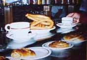 | サンチョ・パンサにも一礼して朝食を食べにマヨール広場 に向かう。Bar(スペイン風安食堂)に入って、 Madrid 名物Churros(スペイン風ドーナッツ)と Cafe con Leche(カフェオレ)を注文した。 Churrosを日本でだけ食べたことある人の多くは 顔をしかめる。 「あの甘ったるいドーナッツか」 でも本場のChurrosは塩味、サクサクして 美味しいのです。 |